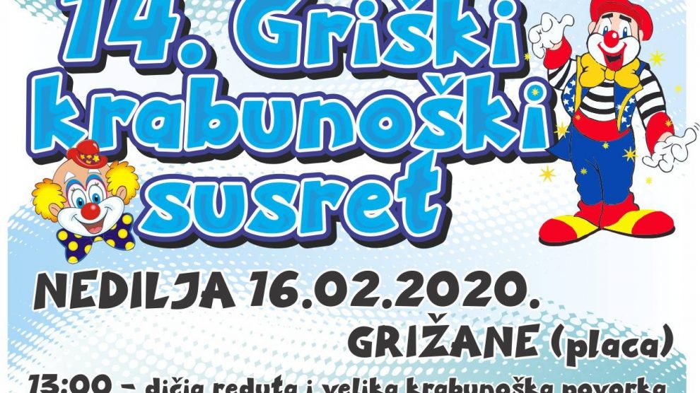 Na 14. Griškim krabunoškim susretima u nedjelju predstavit će se 17 grupa i 700 krabunosa, zvončara, maškara, mačkara i mesopustara. Povorka kreće sa Potočine prema griškoj placi u 13 sati, predvođena dječjom redutom. Po dolasku na grišku placu slijedi predstavljanje grupa pod voditeljskom palicom Nevena Barca i Danijela Blažičevića. Posjetitelji će moći uživati u krabunoškom slavlju uz dobru muziku, kapljicu i tradicionalno jelo našeg kraja „jotu“.