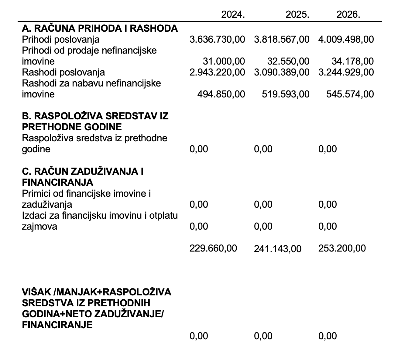Prihodi proračuna sa projekcijom 2025.-2026. godine po ekonomskoj klasifikaciji te rashodi po ekonomskoj klasifikaciji utvrđuju se u Računu prihoda i rashoda i računu zaduživanja/financiranja.