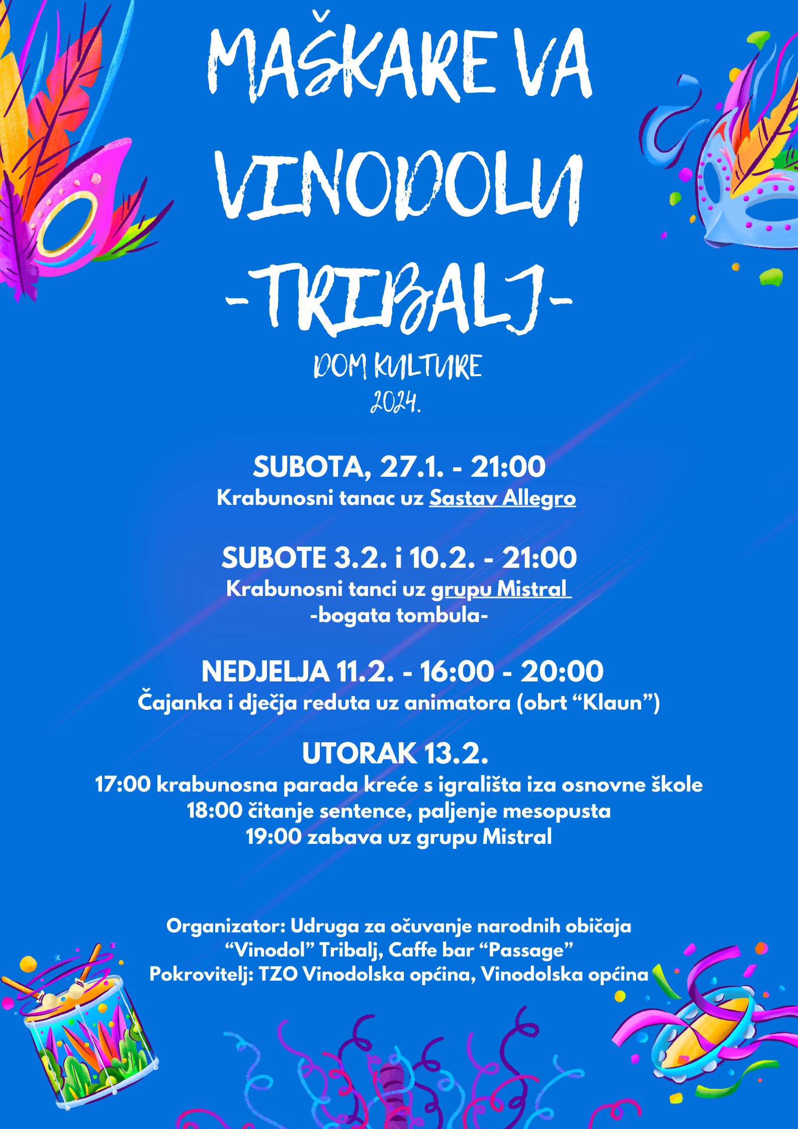 Udruga za očuvanje narodnih običaja Vinodol iz Triblja organizira još dva krabunosna tanca, subote 3.2. i 10.2. gdje će posjetitelje zabavljati grupa Mistral, dječju redutu i čajanku 11.2. uz animatora Martina iz obrt Klaun, a zadnji dan mesopusta, 13.2. nakon povorke, čitanja šentence i paljenja mesopusta, nastavlja se zabava u Domu kulture Tribalj, ponovno uz grupu Mistral.